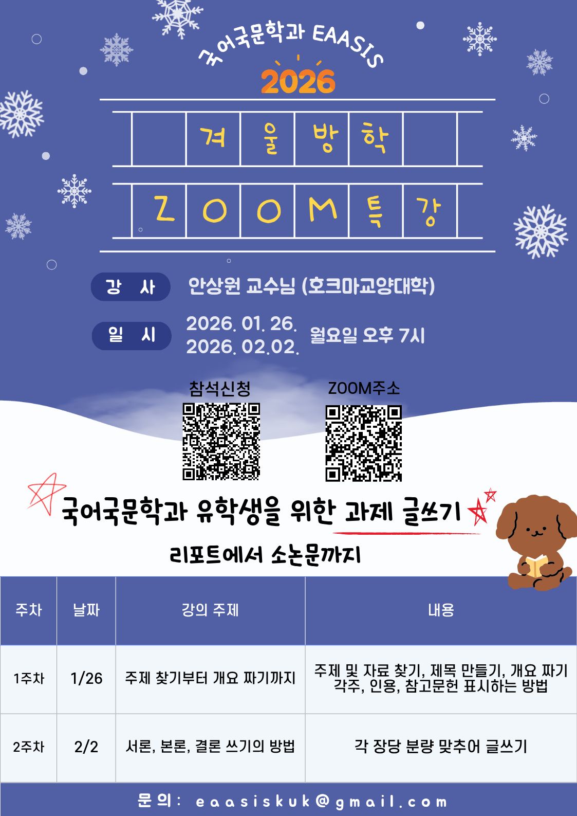 국어국문학과 EAASIS에서 "국어국문학과 유학생을 위한 과제 글쓰기-리포트에서 소논문까지"를 주제로 겨울방학 zoom 특강을 준비하였습니다.